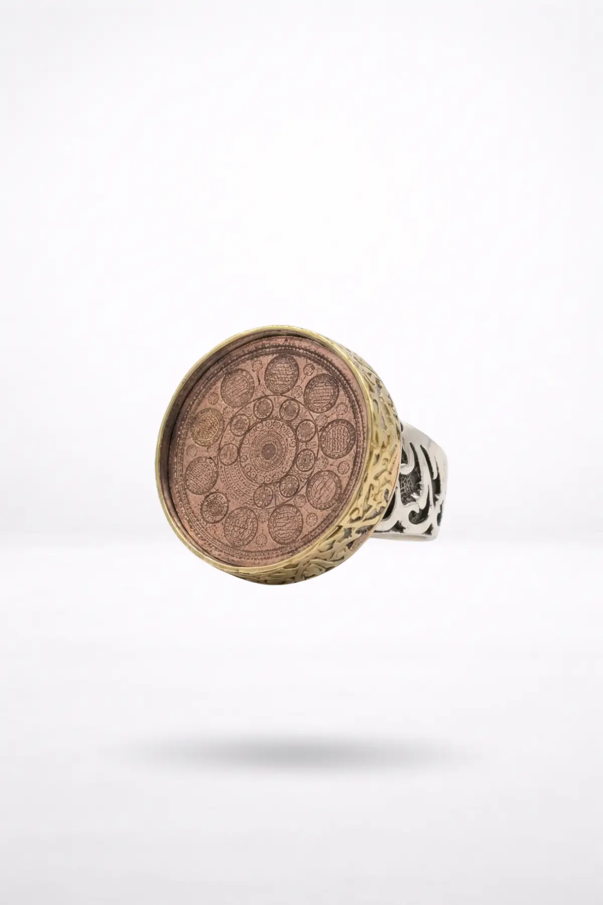 "Görseldeki yüzüğün en etkileyici yanı, yan taraftaki altın tonlu işlemelerin (rûmî desenlerin) yüzüğe kattığı 'Sultan' havasıdır. Bu yüzük, takım elbise ile takıldığında 'Otorite', geleneksel kıyafetlerle takıldığında 'İrfan' sahibi bir duruş sergiler. Parmağında hem ağırlık hem de anlam arayan beyefendiler için eşsiz bir seçim."