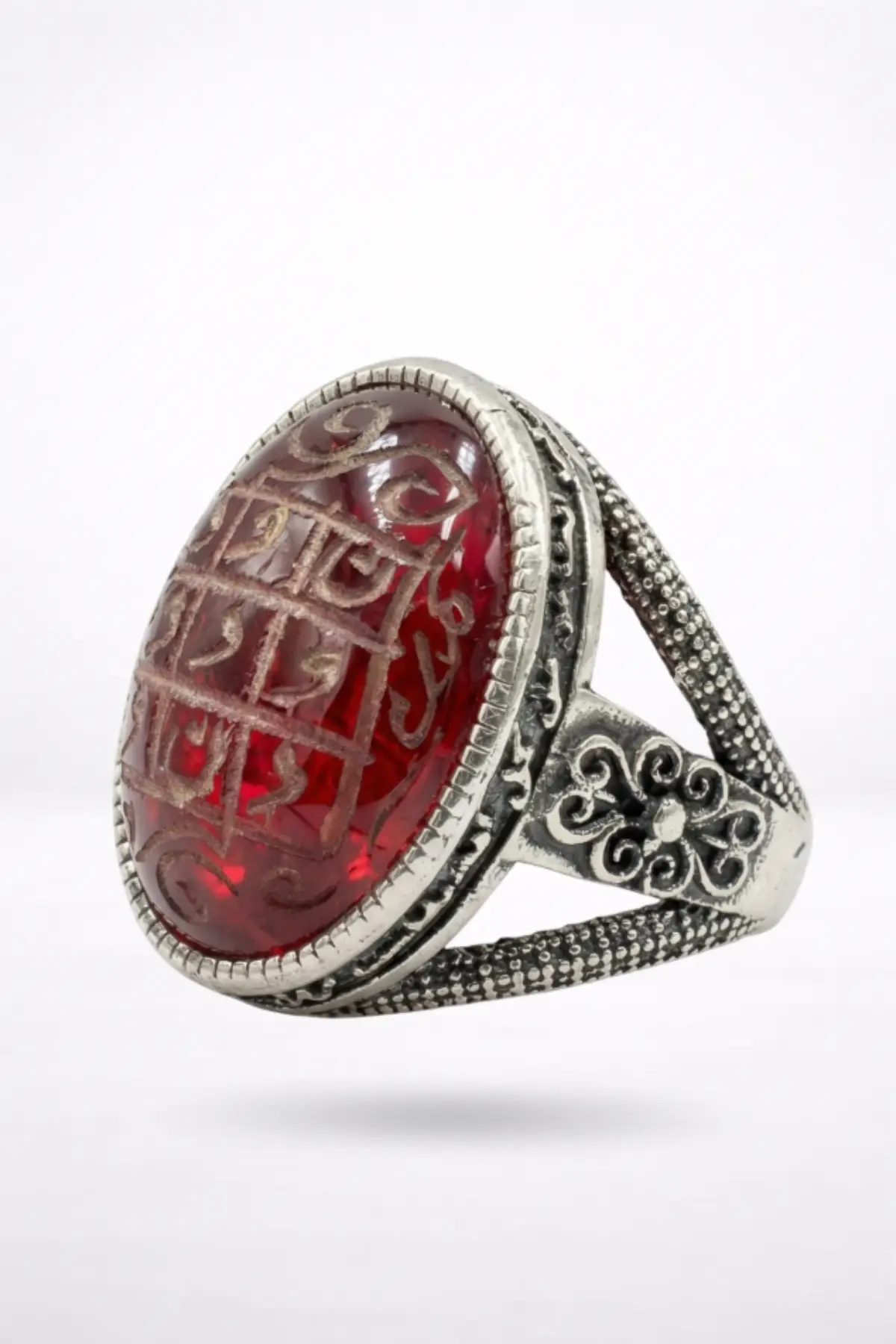 Kan taşının sıcak, asil duruşuyla bütünleşen Tılsım-ı Nur yüzüğü; sıradan bir aksesuarın ötesinde, auranızı saflaştıran ve simanıza ilahi bir aydınlık katan tılsımlı bir yoldaştır. Taşın merkezine nakşedilen o kusursuz müselles (üçlü) vefk ve gümüş kasasını çevreleyen kadim dualar, hakikat yolcuları için ince bir manevi anahtardır.